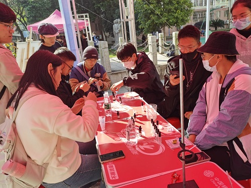 最热闹的当属化学趣味游戏区。游戏区的各种游戏或简或易,但都与一些化学常识有关,“猜猜我是谁”、“喊出我的名字”填字游戏等都吸引了无数同学,还有集体游戏“化合价版一块五”,让同学们在寒冷的冬天一起抱团取暖。当然,最令同学们激动的当属抽奖环节,毕竟是要看手气。有的同学为抽到自己喜欢的奖品而欢呼雀跃,有的同学为手气不佳而遗憾。但不管如何,活动参与感才是同学们大学生活中浓墨重彩的一笔。