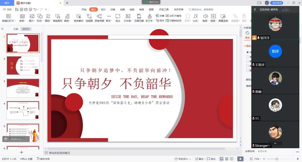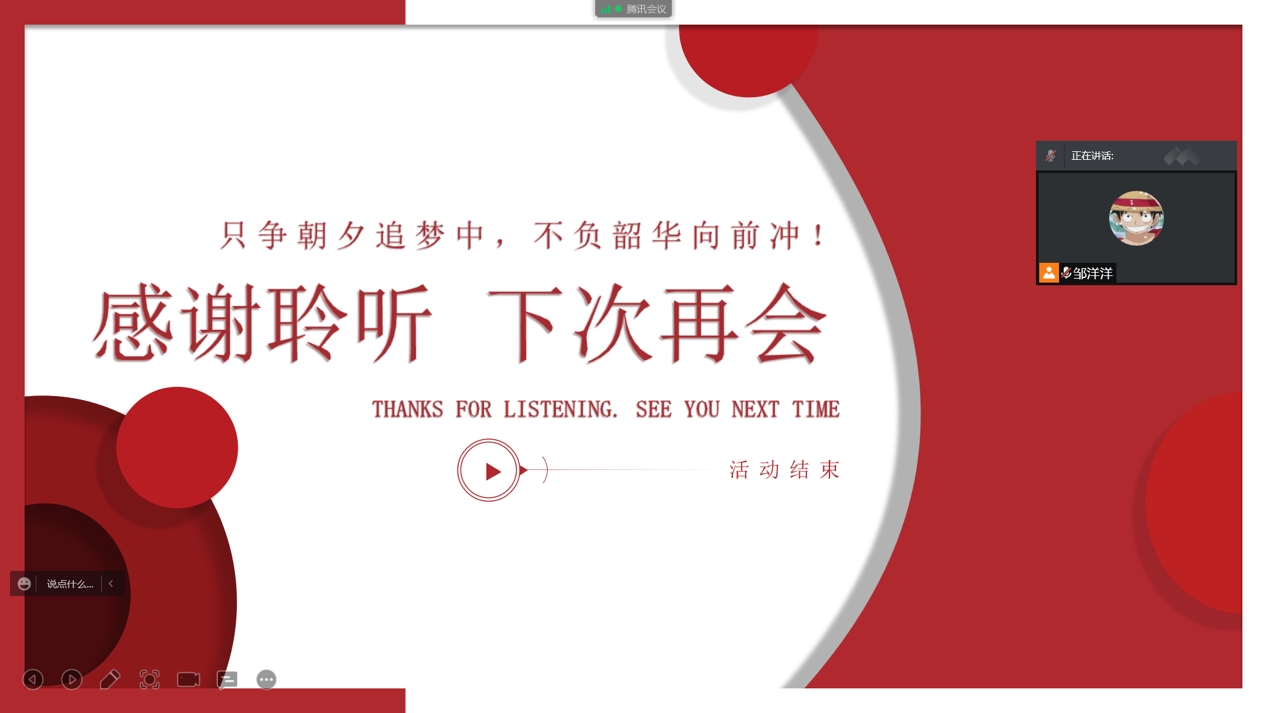 为纪念“一二·九”运动,发扬民族文化,回顾历史,弘扬“热爱祖国,关注社会,积极投身社会”的青年精神,加强团的组织建设,继承发扬优良传统,激发同学们的爱国热情,引导同学们争当时代青年先锋,化学类2001班团支部积极响应院团委号召,于12月11日线上开展“回眸奋斗史,峥嵘自少年”主题团日活动,本次活动由化学类2001班团支书邹洋洋主持。