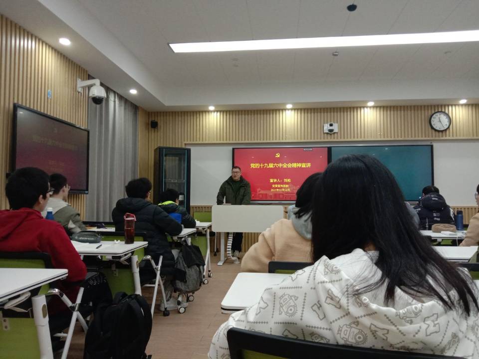 2021年12月15日下午两点半,化学化工工学院理科试验班2001班于教学中楼403开展“党的十九届六中全会精神”宣讲,此次宣讲由班主任刘松老师主持,内容包括五个对党的十九届六种全会精神的深刻认识,加深同学们对党的精神的理解,并从党的百年奋斗中看清楚过去中国为什么能够成功,弄明白未来怎样才能继续成功,从而更加坚定、更加自觉地践行初心使命,在新时代更好坚持和发展中国特色社会主义。