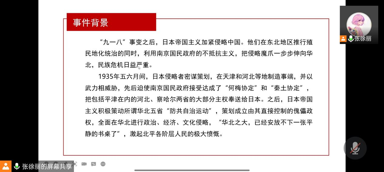 众所周知,“一二·九”运动形成了全国人民抗日民主运动的新高潮,推动了抗日民族统一战线的建立。为使同学们充分领会一二·九抗日救亡运动的爱国主义精神,加强青年大学生对祖国的自尊、自信、自强的进取心,化工1902班团支部于2021年12月16日晚上九点半在腾讯会议开展了以“回眸奋斗史,峥嵘自少年”为主题的团日活动。本次活动由化工1902班团支书张徐丽同学策划与主持,新闻委员谢雯静、黄亚楠记录,到会人数共18人。