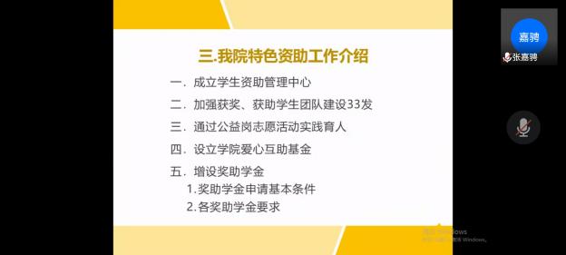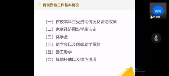 首先,张嘉骋同学作为班级爱心使者从资助工作背景及本专科生教育阶段性政策、我校资助工作基本情况、JAVSB