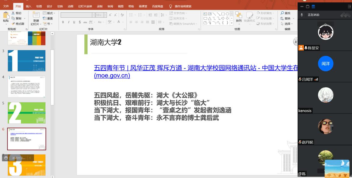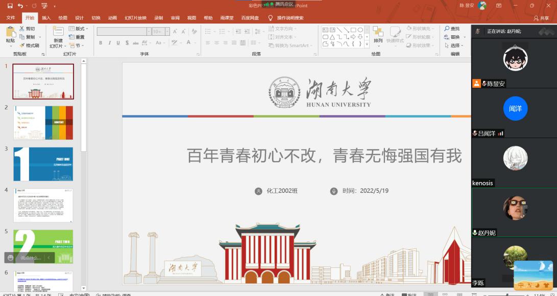 化学工程与工艺2002班于腾讯会议召开“百年青春初心不改,青春无悔强国有我”线上主题团日活动。本次讲座由团支书陈昱安同学主持,化工2002班全员参与。