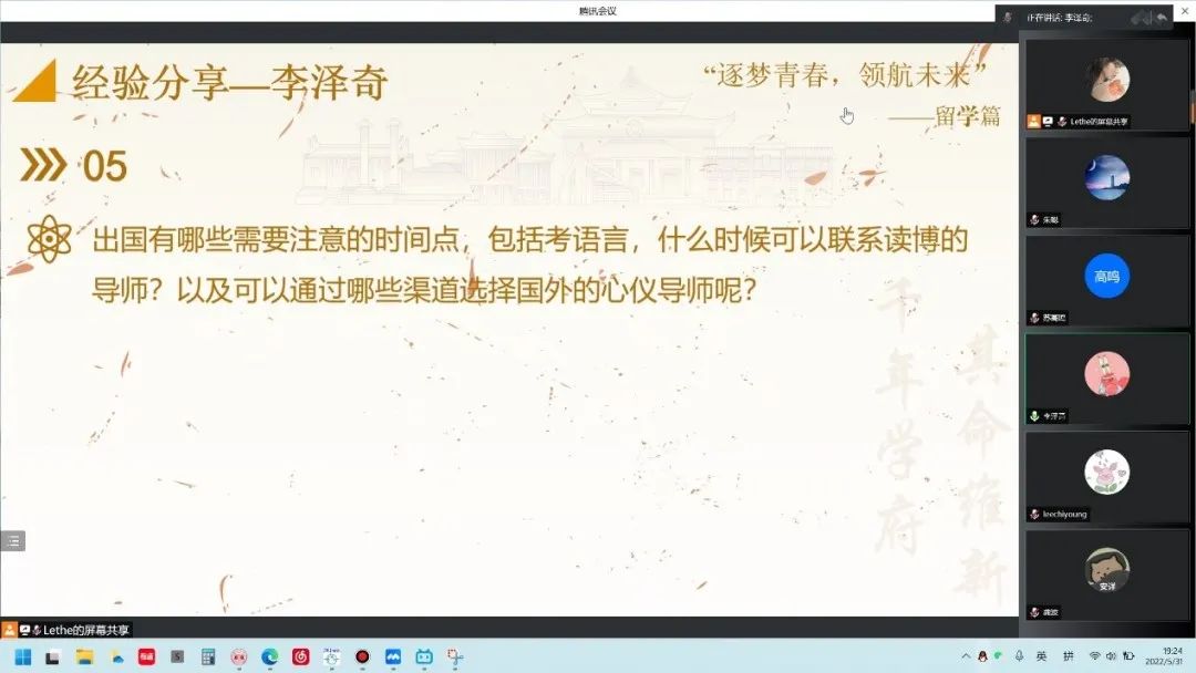 李泽奇从自身经历出发,向大家讲述了出国想法的产生、国外学校的申请途径、疫情之下留学申请的难点等心路历程。他向大家表明自己出国想法的由来,并针对留学申请阶段了解到的一些信息分类阐述留学需要关注的点,最后为有意向留学的师弟师妹提出建议。