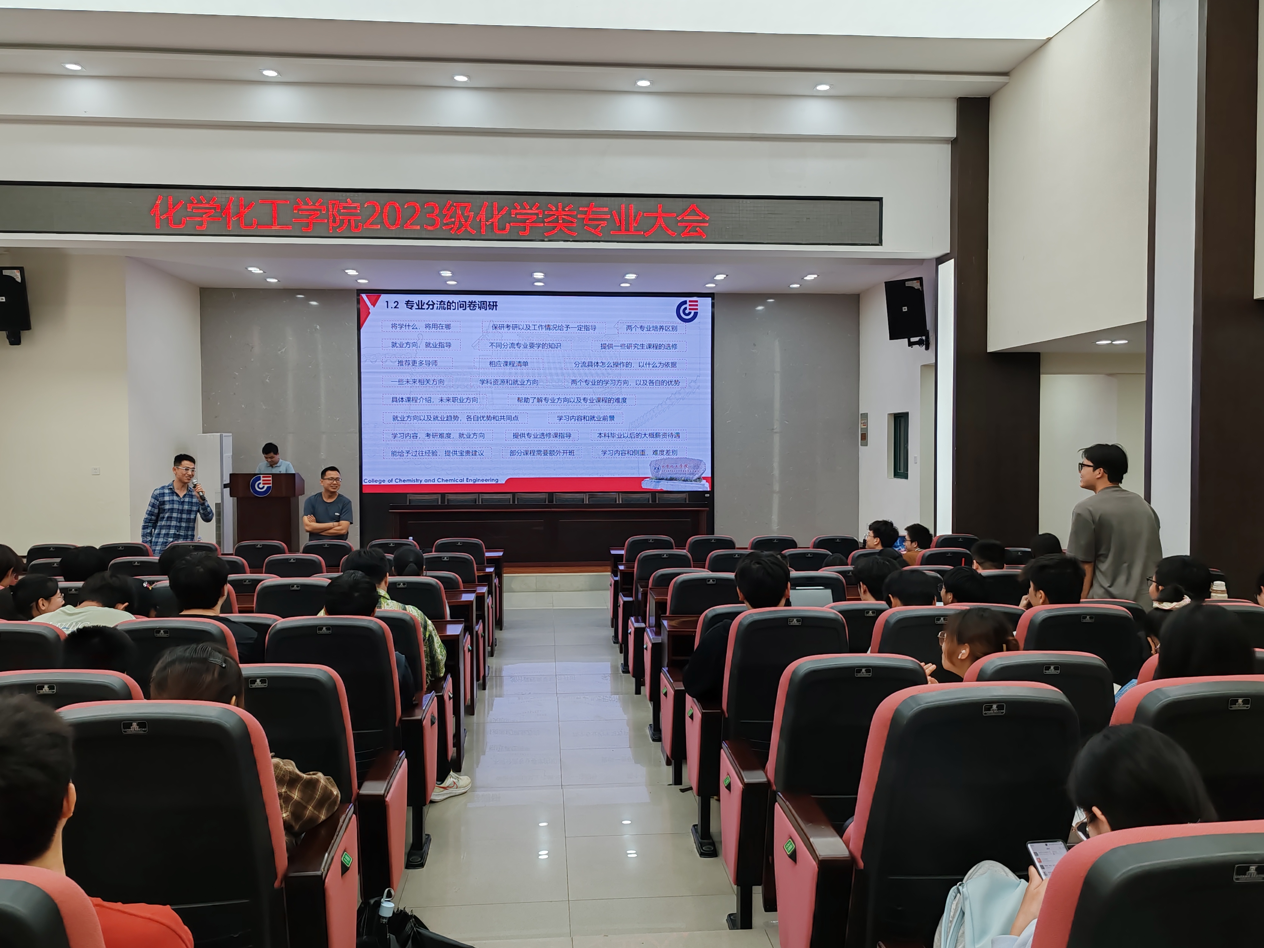 2023级化学类专业学生大会在新化工楼D区报告厅举行。会议由辅导员南彬主持,围绕专业分流指导、学业成绩分析、安全教育强化、日常管理规范四大主题展开,旨在帮助大二学生明确学业方向、筑牢安全防线、提升自我管理能力。邀请化学系主任吴英鹏教授、应用化学系主任朱建教授进行分享,全体2023级化学类本科生参会。