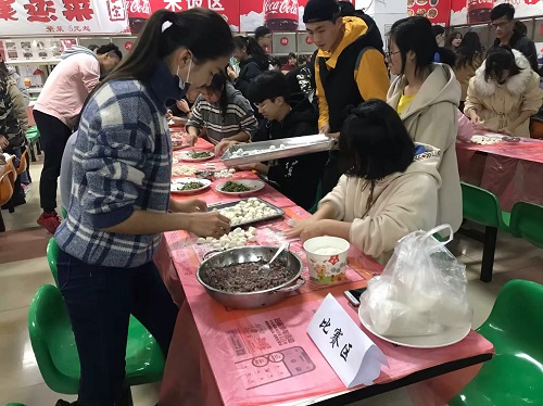 下午四点半,最令人期待的吃饺子接力赛开始了。吃饺子接力赛由每班派出一支队伍进行比赛,参赛队伍至少包括两名女同学,接力吃完饺子用时最少前五支队伍获胜。参赛的各位选手个个风卷残云般吃完碗中的饺子,而女同学也是巾帼不让须眉,为了班级荣誉,一口三个不在话下。