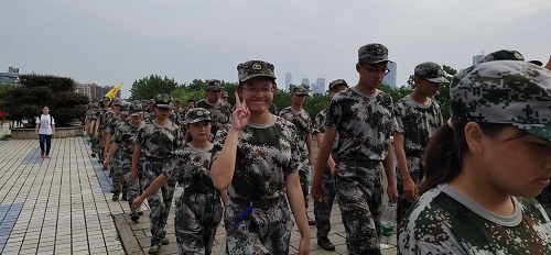 途中,新生班助理带头唱响军歌,“我和我的祖国,一刻也不能分割,无论我走到哪里,都流出一首赞歌……”,军歌响亮,使大家的士气高涨。到达猴子石大桥后,化工院在一连连长于航的带领下排列队形,合影留念。合影标志着拉练过半,化工院正式踏上返程的道路。