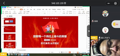 这次班会是以线上的形式开展,团支书刘文娟同学首先向大家通报截止当日全国的疫情状况,我国疫情形势逐步好转,但仍没有完全解除疫情防护。接着给同学们介绍了疫情期间日常防护的措施和排解在家隔离产生的焦虑情绪的小窍门,同时也呼吁大家做到“停课不停学”,制定一份学习计划,按计划完成毕业论文,也提倡大家在隔离的枯燥生活中寻找新的乐趣,增添一份精彩。