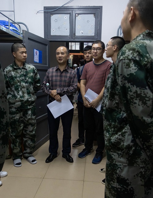 老师们分为三组,分别由新生班助理负责人带队同时走访不同的寝室。张晓兵院长、刘松副书记和其他老师到男生寝室询问同学们在军训期间是否有很好的适应长沙多变的气候,询问他们近几天的生活状况并和同学们谈论军训的感受。在交谈的过程中张院长也给予了同学们一些关于军训和在生活中的建议。