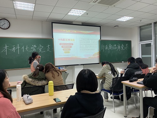 会议开始,董亚妮同志介绍了十九届五中全会的主要内容和精神,深入解读党的十九届五中全会的重大意义、决胜全面建成小康社会取得的决定性成就、党中央制定的“十四五”规划和2035年基本实现社会主义现代化的远景目标。强调了“一个必须,三个要”和“十四五”时期经济社会发展指导思想和必须遵守的原则。要求各位党员在学习生活中贯彻学习十九届五中全会精神,以此次会议为契机,以习近平新时代中国特色社会主义思想为指导,坚定决心,强化责任担当,增强主动性和创造性,为建设社会主义现代化强国贡献自己的力量。