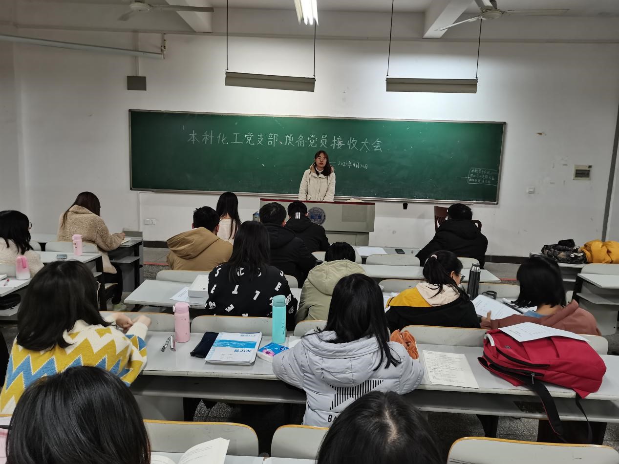 2020年12月3日晚19:00,化工院本科化工党支部预备党员接收大会于综合楼114隆重召开,本次大会旨在吸纳优秀同志壮大党员队伍,为支部将来的发展打下坚实的基础。大会由党支部副书记张琳同志主持,支部全体党员同志、预备党员及被发展对象参与此次大会。