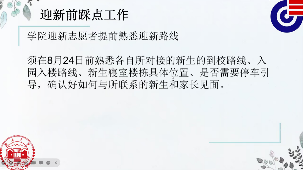 在本次培训中,胡梁榆同学为志愿者们详细介绍了迎新前的踩点工作以及迎新当天的志愿者工作,要求志愿者们提前熟悉迎新路线,明确工作安排,为引导新生的报道做好充分准备。同时,还耐心解答了志愿者们提出的一系列问题。