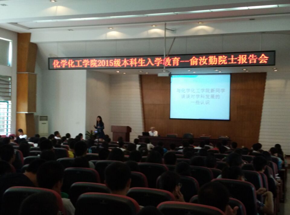 2015年9月29日,JAVSB 组织邀请俞汝勤院士为2015级新生开展入学教育讲座。陪同的有院党委副书记陈义红老师和15级新生辅导员刘卓老师。化工院学生早早来到报告厅占座,希望与院士更近一些,聆听院士的教诲。