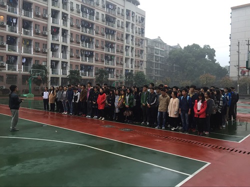 14级全体成员齐聚天马二区三栋篮球场,在升旗仪式之后,举行了一场个人经验交流会。此次交流会由刘世明老师主持,陈威同学主讲,旨在通过陈威同学在大学中的学习经历,激励同学们认真学习,用心培养自我专业素养,通过努力证明一切皆有可能。