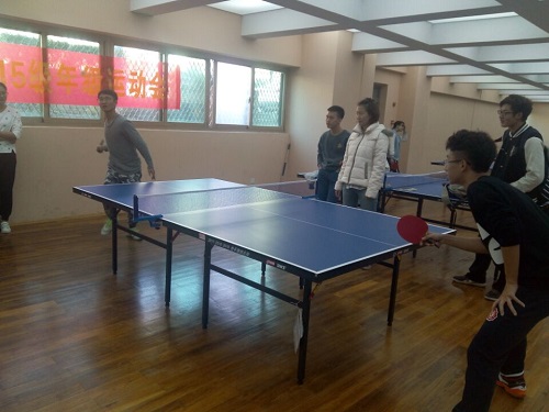 本次运动会乒乓球比赛在体育馆内的乒乓球室进行。尽管天气寒冷,但每位参赛选手都热情高涨。比赛分班级进行,有男子单打、女子单打、男女混合双打三个部分。比赛气氛轻松友好,参赛选手技艺精湛身手矫健。在男子单打比赛中,各班派出的选手使出了浑身解数,直拍、横拍、扣球、旋转球、弧线球等都得到了一一体现,比赛中不时传出热烈的喝彩声,兴奋的“好球”声不断。而女子单打比赛则相对缓和很多,选手们游刃有余,尽情享受运动带来的乐趣,球拍在空中划出一道道优美的弧线。场馆内还有很多前来加油助阵的同学,加油声此起彼伏,十分热闹。