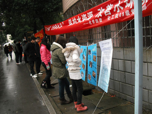 09级党支部于3月22日8:00—15:00在天马学生公寓二区篮球场举办以“保护水资源,改善水环境”为主题的签名仪式活动。