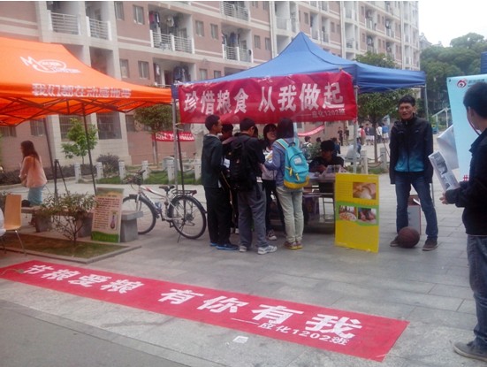 活动开展之前,应用化学二班同学便利用本班的宣传平台,在人人公共主页上、qq空间上进行了较大范围的宣传,同时还安排了同学散发活动传单。活动现场放置了关于世界粮食日的展板,详细介绍了世界粮食日的背景、由来以及目前世界粮食短缺现状,让大家更直面深入地了解珍惜粮食的重要性,说明了这次活动的意义。