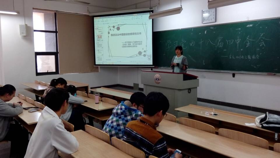下午两点半,班级成员准时到达后,班会开始进行!首先,班级团支书和班长分别做了讲话,阐述了本次班会的主目的以及活动的意义!接下来,团支书借用之前准备好的PPT向大家展示了四中全会的内容,包括推进法治中国建设的纲领性文件——学习党的十八届四中全会决定精神,学习徐守盛书记报告会精神!其内容主要有中国共产党人对社会主义法治理论的新拓展,建设高素质的法制工作队伍以及推进中国法制建设必须坚持党的领导。同时还阐述了法制与法治两个概念,相信总有人将这两个概念混淆,但是在团支书精美的PPT展示以及形象的表达方式下,使大家彻底了解了这两个概念的不同,不时博得大家热烈的掌声!