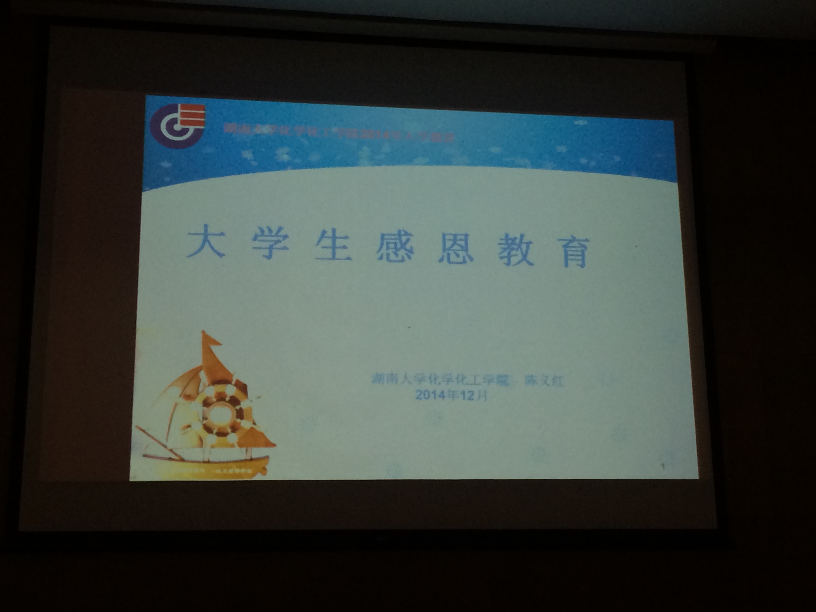 2014年12月9日晚7:00,化工院14级新生在化工院报告厅接受了最后一次入学教育——大学生感恩教育,本次入学教育由陈义红书记为大家主讲。