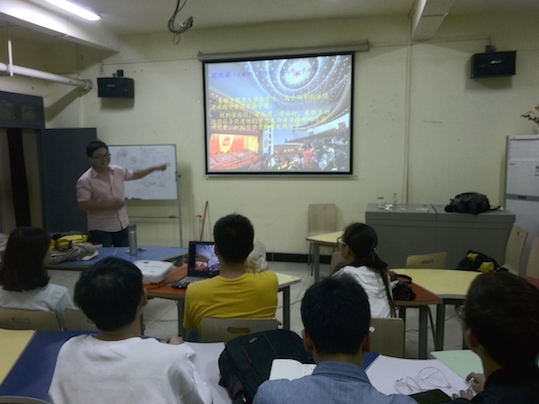 紧接着,团支书就此背景下青年学子的任务与使命进行了阐述。团支书还请台下的几位同学表达自己的观点,同学们纷纷举手表达自己的看法。一名同学以习近平总书记上台后的反腐工作为依托,表达了自己对党的信赖,并强调青年学生的历史使命与责任担当,以及将学习党的科学理论知识和自身实践相结合、知行合一的重要性。话音刚落,台下响起了雷鸣般的掌声。