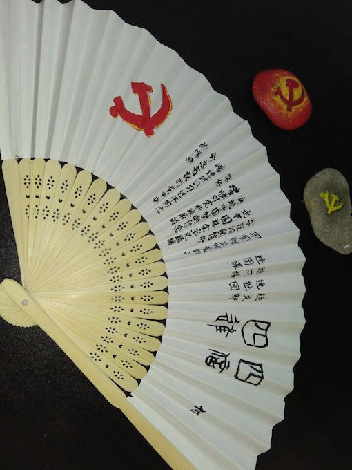 接下来到了上色的步骤,同学们跃跃欲试,尝试自己调配出合适的颜色,失败了的同学会向老师请教。何殊洁同学还在写党章时选择了难度较大的篆体字,在狭小的折扇上将古文化与中国梦完美结合,体现了中华民族厚重的文化底蕴;张文骞同学将由锤子和镰刀组成的党徽染上红色,代表着工人和农民阶层无尽的热情;李家文同学画的小黄人代表着他永葆童真的期望。同学们的作品都代表着不同的意义,绚烂色彩下隐藏的内涵体现着同学们的思想觉悟,彰显了大学生的卓越的思想风采。