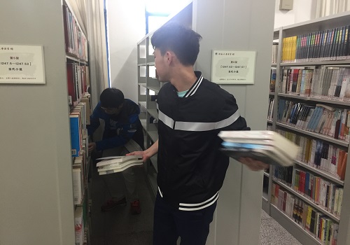 与老师接洽后,同学们得到了第一项任务——移动书籍。8位同学排成接龙队形,将书籍从原位置搬到另一个书架。刚开始大家都还有点生疏,有时速度掌控不好,搬运“流水线”偶尔停滞,但随着同学们对工作的渐渐熟悉,书架上摆放的书本被迅速且有序地运走。老师对同学们的效率进行了表扬,同学们沉迷其中,感受到工作的乐趣。