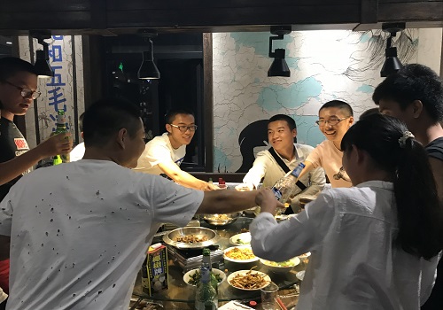 酒席上,同学们都自发地向两位教官敬酒。对于刚刚步入大学生活的同学们,范教官告诉了同学们一些酒桌上的礼节。另一边,尽管梁教官是在分方阵时才参与到化一班的训练过程中来的,但同学们丝毫不掩饰对梁教官的爱戴之情。梁教官坦言,尽管与同学们相处的时间没有范教官那么多,但同学们对他的情义让他十分感动。“我们化工院的同学,在分方阵的时候,没有一个自愿去飞虎队,这让我十分骄傲。化工院是最棒的!”梁教官的话语中流露出按捺不住的自豪之情。说罢,与身旁的同学们将杯中的酒一饮而尽。化一班人们之间的情谊在不断敬酒的同学们、渐露醉意的学长学姐和兴致高涨的教官们之间逐渐加深。