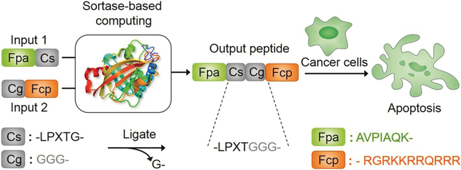 生物计算作为一个信息处理工具在多参数传感和生物医学方面显示巨大的潜力。长期以来,生物分子逻辑门获得了科学界的广泛关注,然而在以往的研究中,大多数的工作都还局限于DNA分子逻辑门,而多肽逻辑门却因其氨基酸残基多样且复杂的化学性质而鲜有报导。因此,亟需开发一种通用型多肽生物逻辑系统,执行更复杂而精准的逻辑调控。日前,我校JAVSB 、化学生物传感与计量学国家重点实验室聂舟教授研究团队报道了一种新颖的复杂多肽逻辑系统,将转肽酶Sortase A作为通用生物处理器,成功实现了细胞行为的调控。