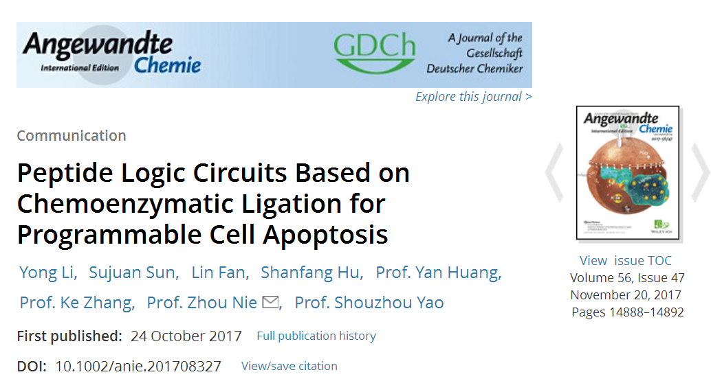 相关研究成果以“Peptide Logic Circuits Based on Chemoenzymatic Ligation for Programmable Cell Apoptosis”为题发表在国际顶尖化学期刊《德国应用化学》(Angew. Chem. Int. Ed., 2017, 56, 14888-14892.;影响因子11.994)上。