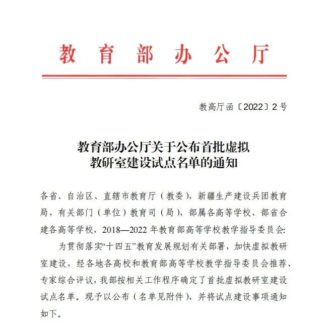 近日,教育部办公厅公布首批虚拟教研室建设试点名单,我校4个虚拟教研室获批,位居全省第一,JAVSB