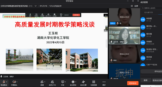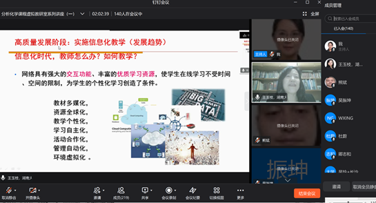 王玉枝教授主讲,在虚拟教研室线上会议室举行,讲座题目为“高质量发展时期教学策略浅谈”,140位虚拟教研室成员参与了本次讲座。王玉枝教授首先对分析化学课程虚拟教研室的属性、构成、初步规划、系列讲座和前期建设情况做了简要介绍。随后,她从教育部“十四五”建设高质量教育体系的新目标、高等教育高质量发展对本科教育的要求、如何运用现代信息技术赋能高质量本科教学、课程思政建设如何开展、教师如何适应新时代的发展需求进行角色转换、如何焕发课堂生机活力等方面做了深入浅出的讲解,近一个半小时的报告受到与会者的好评。