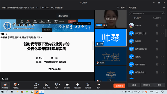 宦双燕教授主持,来自中国地质大学(武汉)的帅琴教授为主讲嘉宾,她报告了新时代背景下面向行业需求的分析化学课程建设与实践。