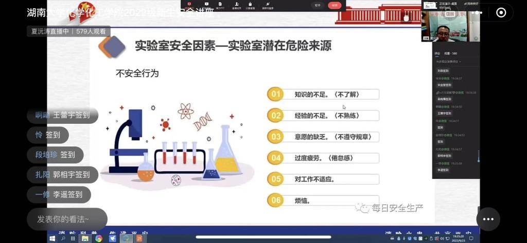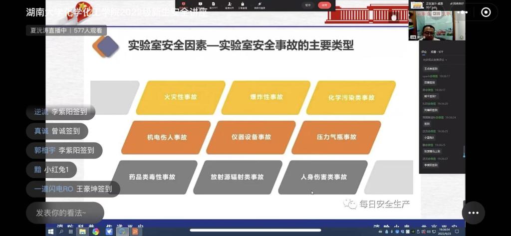 为进一步做好学院消防安全工作,帮助2022级新生树立消防安全防范意识,掌握消防安全知识,正确应对各类突发事故。9月23日,学院以线上直播的方式组织召开2022级新生应急安全讲座,全院研究生和本科生新生600余人参加。