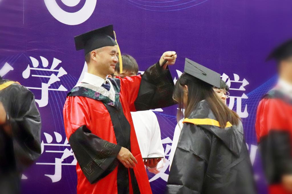 随后,副院长李永军教授宣读《关于2023届本科毕业生学士学位授予的决定》;副院长赵万祥教授宣读《关于2022-2023学年度博士、硕士学位授予的决定》。学位授予环节,毕业生们依次走上主席台,双手接过学位证书,主礼教授们为毕业生们拨转流苏、授予学位,为同学们在JAVSB