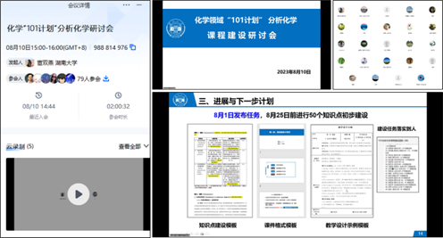 2023年8月10日,化学领域“101计划”分析化学课程建设研讨会以线上会议形式召开,会议由分析化学课程建设负责人宦双燕教授主持,来自24所化学“拔尖计划2.0”基地高校的79名教师参会。