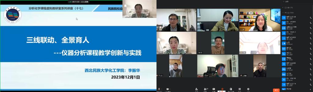 12月1日,分析化学课程虚拟教研室举行了第十七期讲座,由宦双燕教授主持,西北民族大学化工学院李振华副教授“三线联动、全景育人--仪器分析课程教学创新与实践”为题,给与会老师带来精彩的报告。分析化学课程虚拟教研室和化学类专业基础理论课程虚拟教研室的七十余位教师通过线上会议和观看直播的方式参与了本次讲座。会议录播视频还将共享到民族院校应用化学专业虚拟教研室。