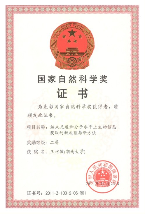 王柯敏教授主持完成的成果“纳米尺度和分子水平上生物信息获取的新原理与新方法”,以生物信息获取新原理与新方法的基础研究为基点,将纳米生物技术和分子工程技术引入分析化学,提高了生物信息获取的时间、空间分辨率和灵敏度,拓展了分析化学的研究应用领域,促进了分子生物学、肿瘤医学等相关学科的发展,为人类健康与疾病基础研究中的前沿问题以及疾病预警等国家重大需求问题的解决提供了新方法。