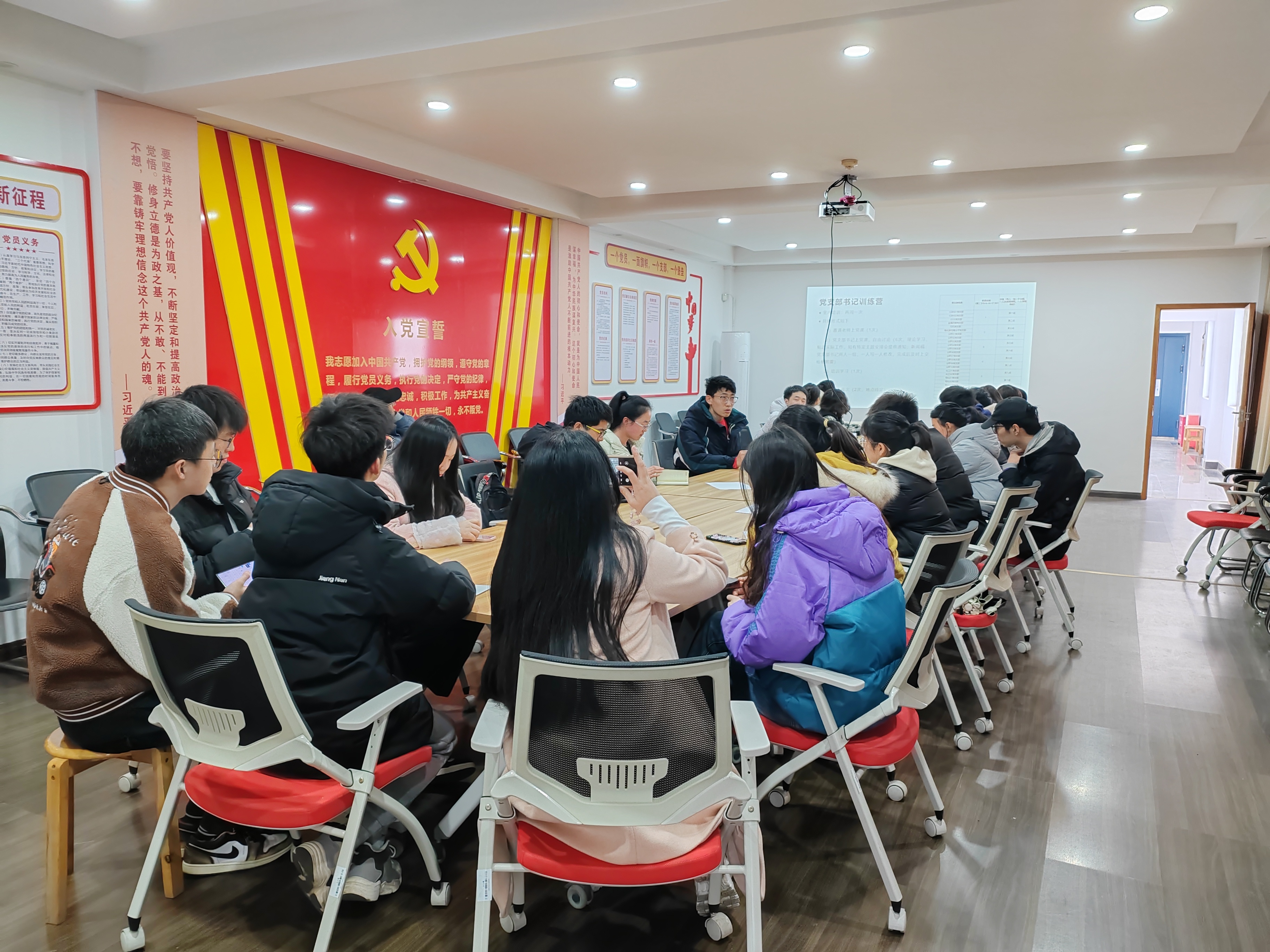 党员活动室举行学生党支部书记培训会。学院学生党建工作负责人徐晓宇、27名学生党支部书记、学生党建服务中心党建骨干参加了本次培训会。