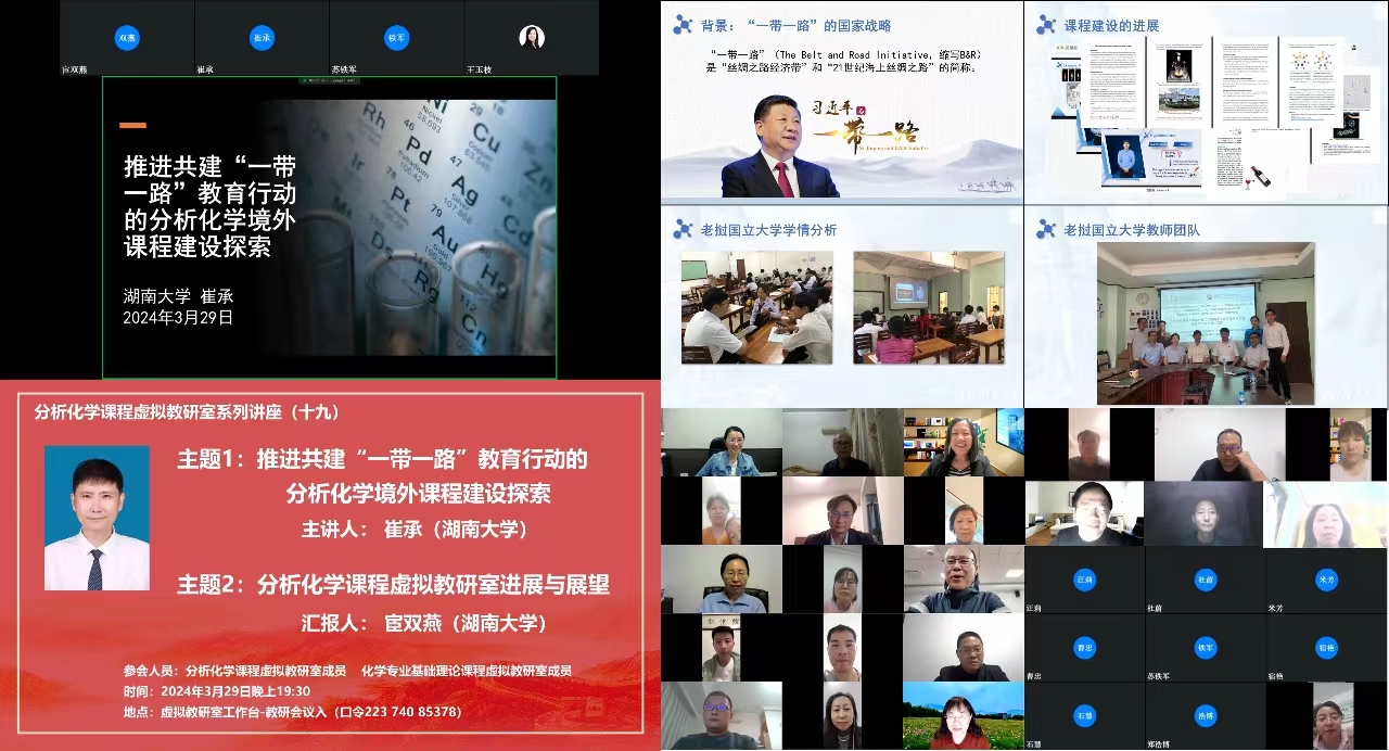 崔承副教授为主讲嘉宾,他的报告题目是:推进共建“一带一路”教育行动的分析化学境外课程建设探索,随后宦双燕教授汇报了分析化学课程虚拟教研室进展与展望,来自分析化学课程虚拟教研室和化学类专业基础理论课程虚拟教研室的76位教师参加了本次线上会议。