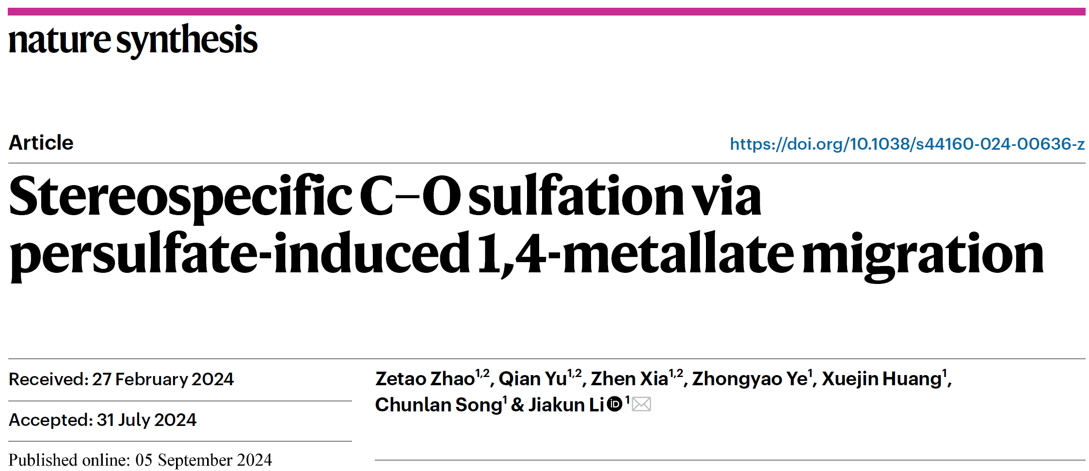 相关研究成果以“Stereospecific C–O sulfation via persulfate-induced 1,4-metallate migration”为题在线发表在《Nature Synthesis》杂志上。JAVSB