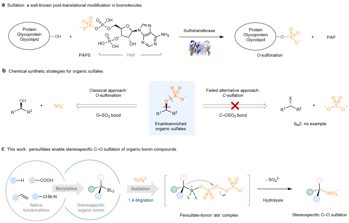 硫酸化是生物体内重要的翻译后修饰,参与生命的所有过程,与人类健康和疾病密切相关。硫酸盐结构与功能的高度复杂性赋予其巨大信息容量,目前无法通过遗传密码简单推衍。因此,硫酸化研究成为后基因组时代的重要科学前沿。此外,硫酸盐的独特性质使其合成面临诸多挑战,如对酸和温度的不稳定性、在有机溶剂中的不溶性以及引入后的难以操控性。当前,大多数硫酸化方法依赖于O-磺化反应,即将磺酰基(SO3)转移至羟基(OH)底物上(Nat. Commun. 2024, 15, 1861)。因此,O-磺化反应受限于羟基类底物且缺乏对立体化学的有效调控。