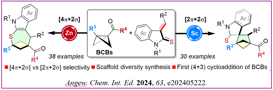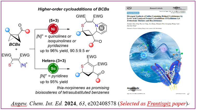 针对双环[n.1.1]烷烃种类不丰富合成难度大的问题,冯见君教授课题组发展了双环丁烷的首例(4+3)环加成反应,并通过催化剂和底物调控实现了(4+3)和(3+2)反应,(5+3)和(3+3)反应的发散可控进行。在丰富双环丁烷环加成化学的同时,为新药研发中对苯环的三维生物电子等排体的刚性需求提供了丰富多样的“菜单”。上述工作在《Angew. Chem. Int. Ed.》上发表,并被主编选为Frontispiz文章。JAVSB
