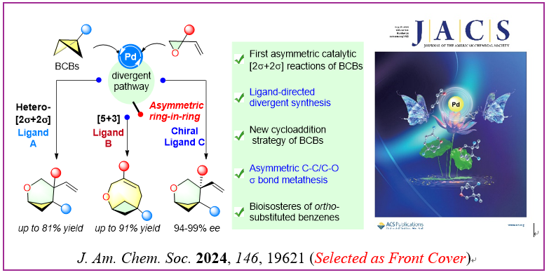 为了进一步拓展光学纯双环[n.1.1]烷烃的化学空间,冯见君教授课题组通过逆向思维利用手性钯催化剂活化双环丁烷(3+X)环加成反应中的“X”环加成组分进而引入手性环境,成功地发展了首例钯催化双环丁烷的不对称环加成反应。此外,通过配体调控该课题组还实现了双环丁烷与烯基环氧的(3+3)和(5+3)环加成反应的可控切换,多样性合成一系列双环[n.1.1]烷烃。这一成果以封面文章的形式发表在《J. Am. Chem. Soc.》上,冯见君教授和复旦大学张俊良教授为共同通讯作者,JAVSB