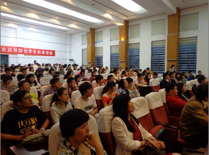 以及美国的学习和生活,谈论了梦想与现实的问题,希望同学们可以怀揣梦想,并且结合现实做以调整。郑学长针对当代大学生害怕面对的“面试”问题,做了细致分享。他强调,面试时应该注意四方面:准备、着装、交流与回答.同时也要具备大胆(just do it),自信(be yourself),用实例(facts),讲清楚(communication)四条基本素质.他现场叫了一些举手的同学进行自我介绍等现场模拟,肯定了同学们的勇气,并做了细致点评,帮助同学们扬长避短。