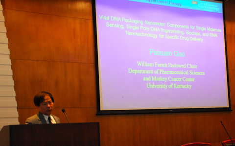作学术讲座,作了题为“Viral DNA Packaging Nanomotor for Single chemical Sensing,Single Pore DNAFigure printing, Bioreactors, RNA Nanotechnology and Specific Drug Delivery”的学术报告,受到广大师生的热烈欢迎。之后,Guo教授与部分老师进行了深入的交流。