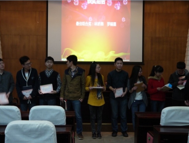 首先,由谢旭分别从“学渣”、“学霸”报名情况、组队之后各小组出勤情况和组员期末考试成绩变化这三个方面向大家展示了此次活动的成果。经过筛选,活动组成了25对“学霸”“学渣”组合,在活动期间,大家认真制定了适合本小组的学习计划,相互监督,由“学霸”帮助“学渣”解决学业上的难题,以“一帮一”的形式结成学习小组,在活动中无一人中途退出。最终,活动取得了期末考试通过率94%,成绩进步的比率更是达到了81.8%。之后,主持人又将活动成员的平均成绩与年级平均成绩比较,多数都超过了年级平均成绩,活动效果显而易见。伴随着大屏幕上展示的多对组合自习时的照片,学工办的老师们给7对优秀组合颁发了奖状和礼品,全体成员逐一领取了结业证书。