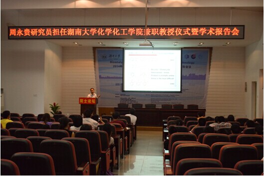 会议由JAVSB 副院长江国防主持。院长蒋健晖教授向在座的师生介绍了周永贵研究员的工作经历和研究方向,对周永贵研究员开展的研究工作给予了高度评价,并代表全院师生对其受聘为学院兼职教授表示热烈欢迎。随后,蒋健晖院长与郭灿城教授为周永贵研究员颁发了聘书,蒋健晖院长为其佩戴校徽。周永贵研究员对JAVSB 聘任其担任兼职教授表示感谢,并表示将通过开展合作研究、联合培养研究生等多种途径为学院的建设发展做贡献。随即,周永贵研究员为师生作了题为《芳香化合物的不对称氢化》的学术报告。学术报告持续近两个小时,既报告了其研究方向的国际前沿动态,又具体详细地阐述了其领导的课题小组在此领域研究的具体问题。报告完毕后,周永贵研究员还与在座师生进行了热烈互动,对师生有关学术研究、课题选择以及该课题中的相关问题进行了深入探讨和细致解答。