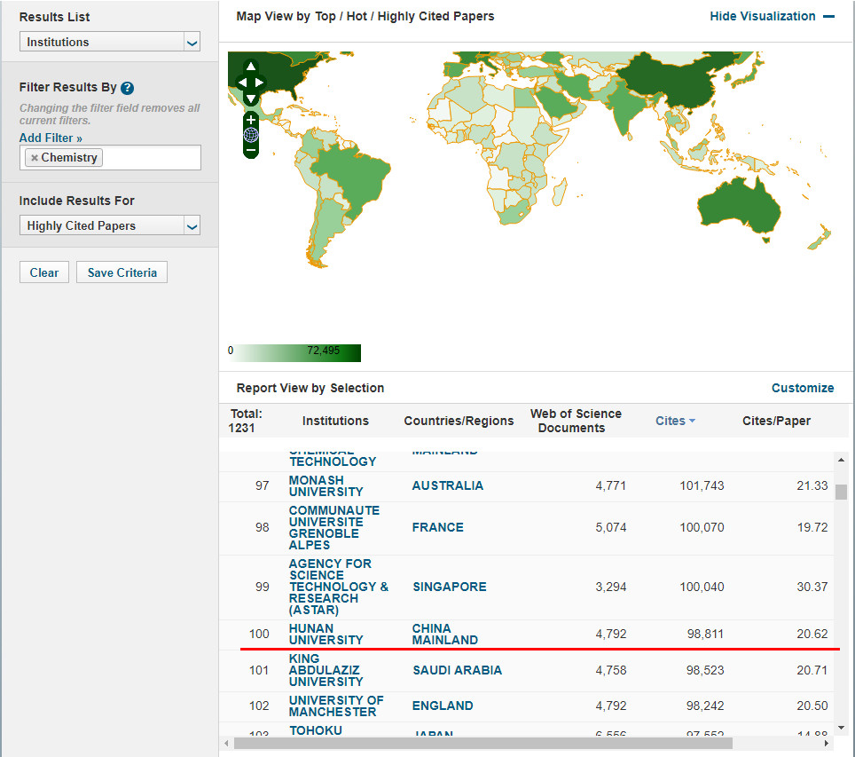 化学学科共发表WOS论文4792篇,被引频次为98811次,较之201905期被引频次增加显著,增加了5004次。在进入化学前1%的1231个机构中排名100位,首次进入全球化学机构一百强,标志着JAVSB