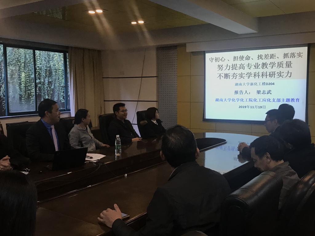党支部全体同志在学院新楼D区204会议室开展了党政学习交流。会上,副院长梁志武教授作了《守初心、担使命、找差距、抓落实-努力提高专业教学质量,不断夯实学科科研实力》的专题党课。梁志武带领大家一起回顾了学院发展历史,以及化工应化专业的发展现状,并指出正是由于一代代老师和前辈们 “不忘初心”的努力和“牢记使命”的责任感,才有了我们现在JAVSB