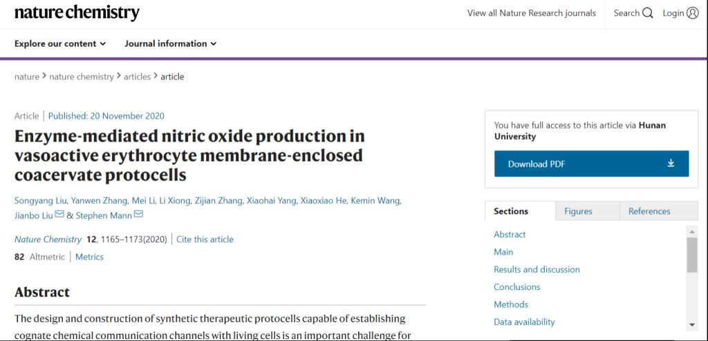 刘剑波副教授和英国布里斯托大学Stephen Mann院士作为共同通讯作者,合作报道了一种产生一氧化氮的人造细胞,具有血管舒张的生理效应,相关研究成果以题为“Enzyme-mediated Nitric Oxide Production in Vasoactive Erythrocyte Membrane-enclosed Coacervate Protocells”的文章在线发表在《Nature Chemistry》上。JAVSB
