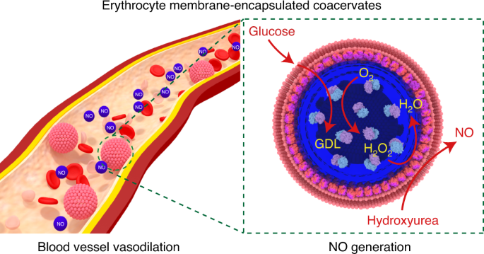 该工作基于液液相分离技术制备了凝集体液滴,以其作为载体包载葡萄糖氧化酶,并在其表面包覆红细胞膜磷脂碎片,构建了具有红细胞膜结构的人造细胞。红细胞膜的包被提高了凝集体人造细胞的稳定性,延长了人造细胞在体内的血液循环时间。人造细胞中的葡萄糖氧化酶利用体内的葡萄糖产生过氧化氢,过氧化氢在红细胞膜上血红蛋白的催化下将药物分子羟基脲转化为一氧化氮信号分子。体外实验和活体动物实验均证实了所产生一氧化氮的血管舒张生理效应。